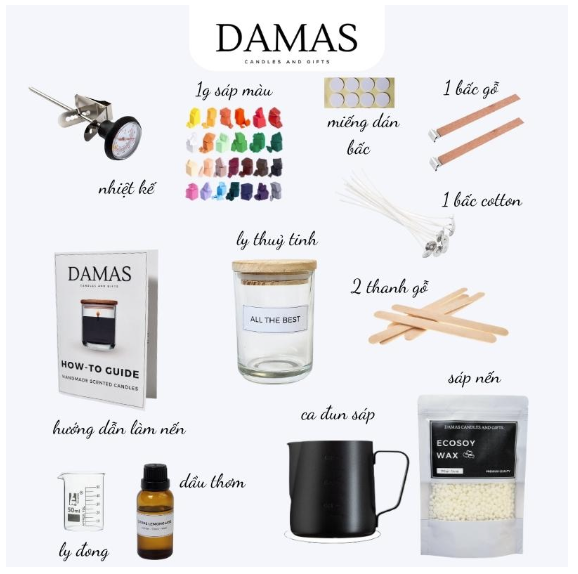 𝐃𝐀𝐌𝐀𝐒 𝐂𝐀𝐍𝐃𝐋𝐄 𝐌𝐀𝐊𝐈𝐍𝐆 𝐊𝐈𝐓: một bộ dụng cụ hoàn hảo để bạn tạo ra những chiếc nến tuyệt đẹp và độc đáo ngay tại căn nhà của bạn. Với bộ dụng cụ này, bạn sẽ có mọi thứ cần thiết để tự tay tạo ra những chiếc nến thủ công độc nhất vô nhị, phù hợp với cá nhân hoặc quà tặng cho người thân yêu.