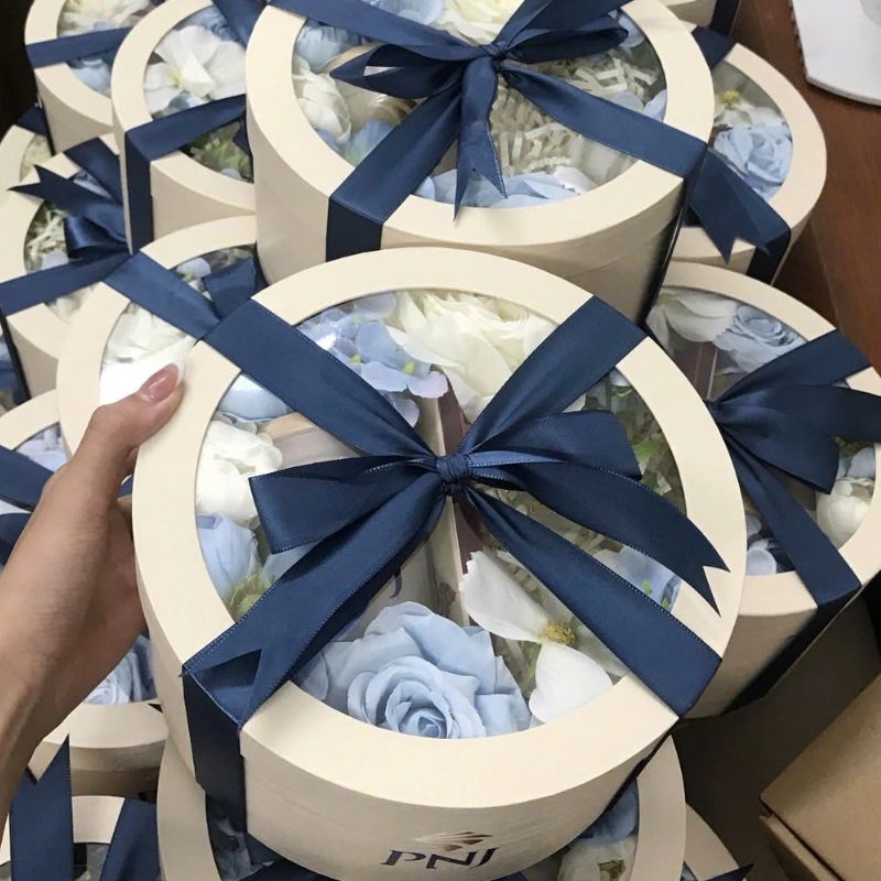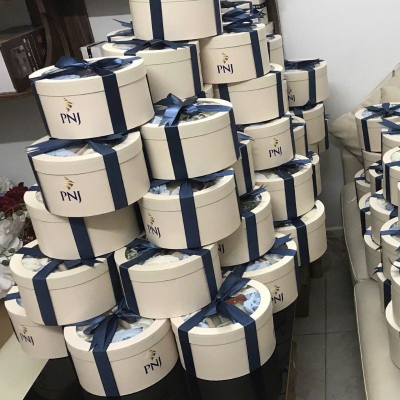 Bộ quà tặng nến thơm & hoa lụa dành cho PNJ với nến 110g, hoa lụa theo tone màu thương hiệu & logo thương hiệu trên hộp cao cấp.