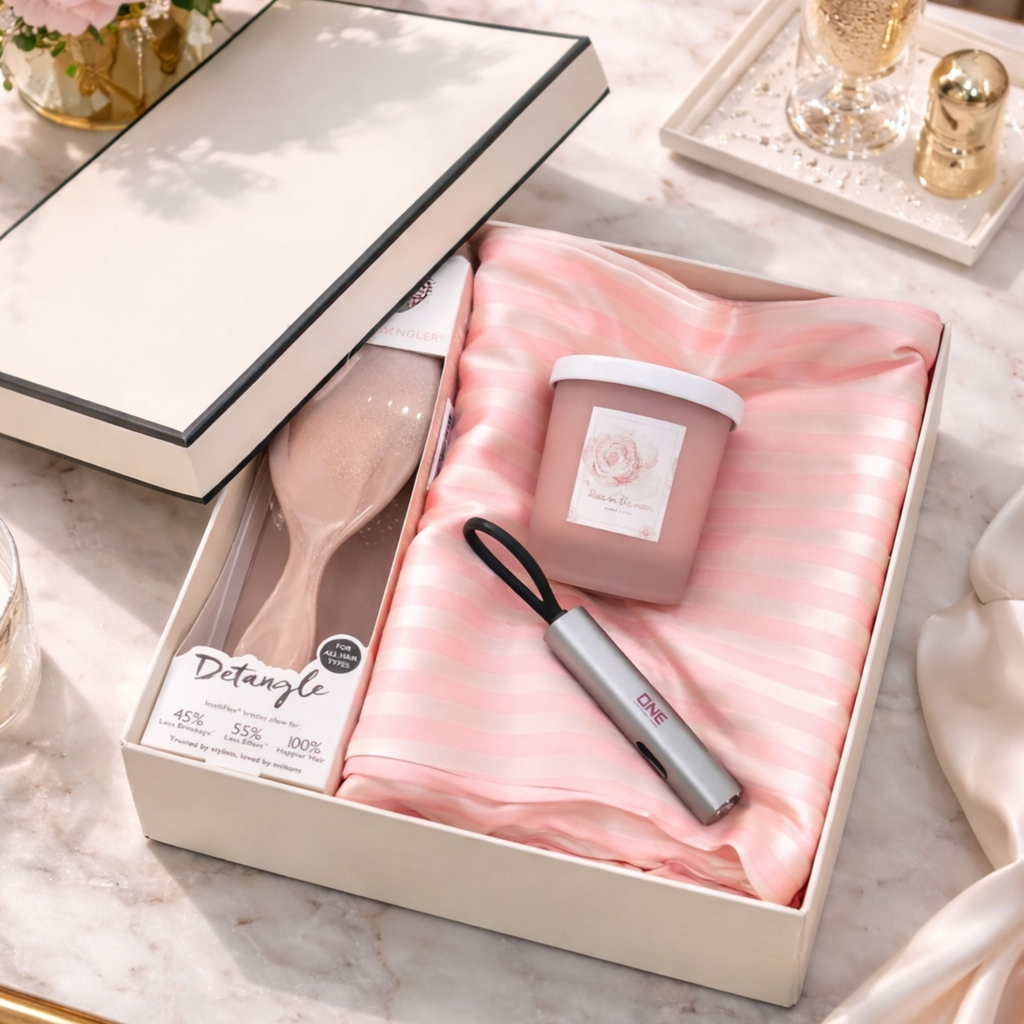 Một set phòng tắm 10 điểm dành cho quý cô với nến thơm, bật lửa điện cho nến, đồ ngủ và lược chải tóc