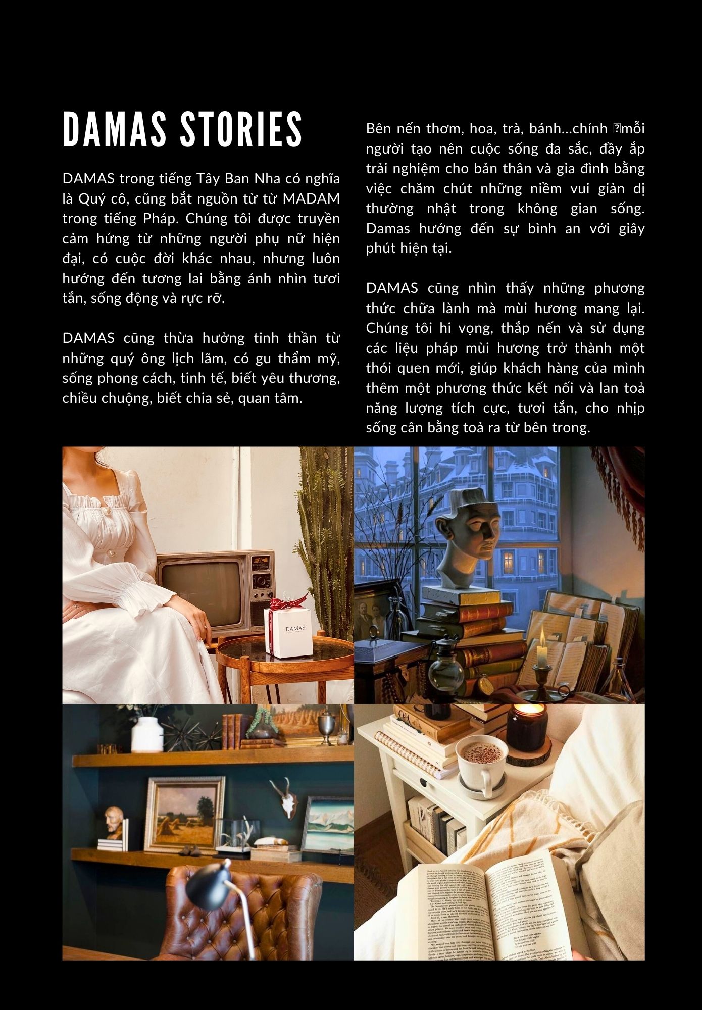 DAMAS theo đuổi các sản phẩm chăm sóc không gian gia đình #homeliving với định hướng Aromatherapy (liệu pháp mùi hương) sử dụng các hương thơm tự nhiên, gần tự nhiên. Thơm êm đềm, gần gũi, không nồng gắt, không gây đau đầu giúp trị liệu, hỗ trợ giảm căng thẳng, mang lại cảm giác bình an, gần gũi trong mỗi ngôi nhà.