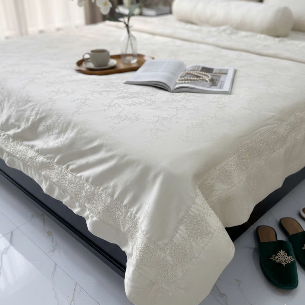 Hoa văn Jacquard mềm như cánh hoa khẽ mở trong buổi sớm. Một lựa chọn dịu dàng cho những ai yêu cảm giác nhẹ nhàng, nữ tính và thư thái tuyệt đối.