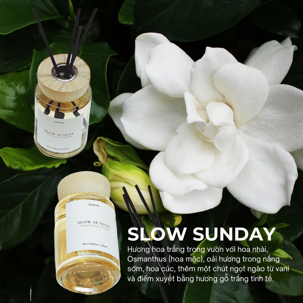 "Slow Sunday" là mùi hương được DAMAS chắt lọc từ sự kết hợp hài hòa giữa hoa nhài, Osmanthus (hoa mộc), oải hương trong nắng sớm, hoa cúc, thêm một chút ngọt ngào từ vani và điểm xuyết bằng hương gỗ trắng tinh tế. Hương thơm mở đầu tươi mát, ngọt thanh như một vườn hoa vừa thức giấc, dần dịu lại trong cảm giác ấm áp, thư thái như khi bạn ngả lưng giữa một buổi trưa yên bình.