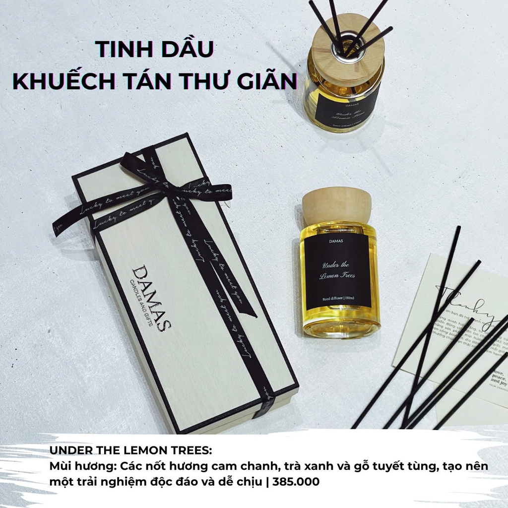 Tinh dầu khuyếch tán thư giãn UNDER THE LEMON TREES: Mùi hương này kết hợp các nốt hương cam chanh, trà xanh và gỗ tuyết tùng, tạo nên một trải nghiệm độc đáo và dễ chịu. Một buổi trốn nắng dưới những tán chanh vàng rực rỡ.