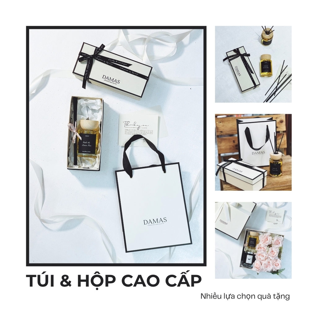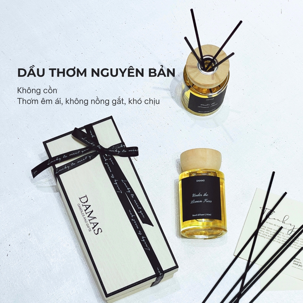 - Tinh dầu khuyếch tán DAMAS được hoàn thiện đựng trong chai thủy tinh chuyên dụng cho tinh dầu, đảm bảo chất lượng không thay đổi, chắc chắn, màu sắc và họa tiết trên thân vỏ thuộc bản quyền của DAMAS không thể tìm thấy ở bất kỳ thương hiệu nào.